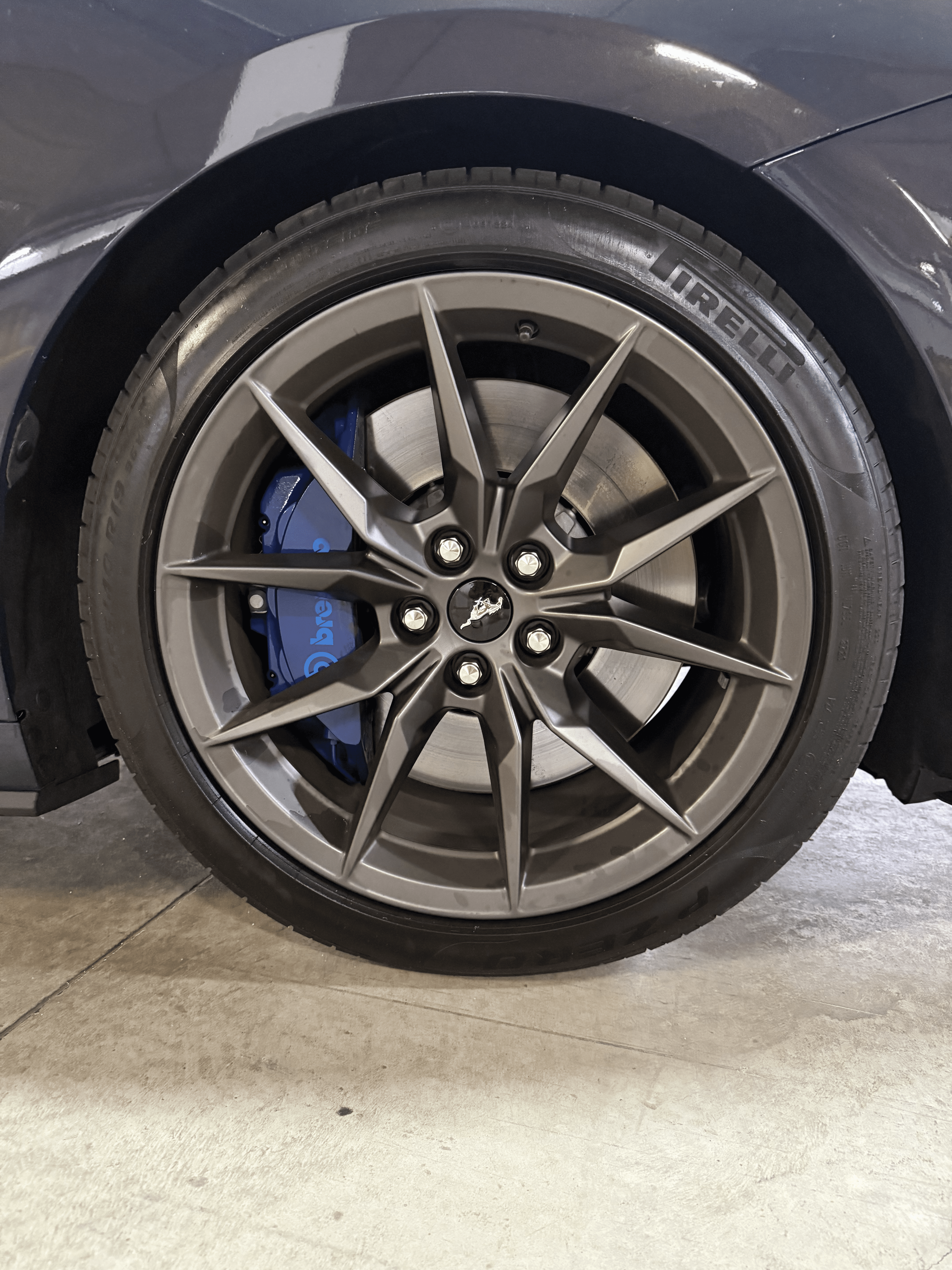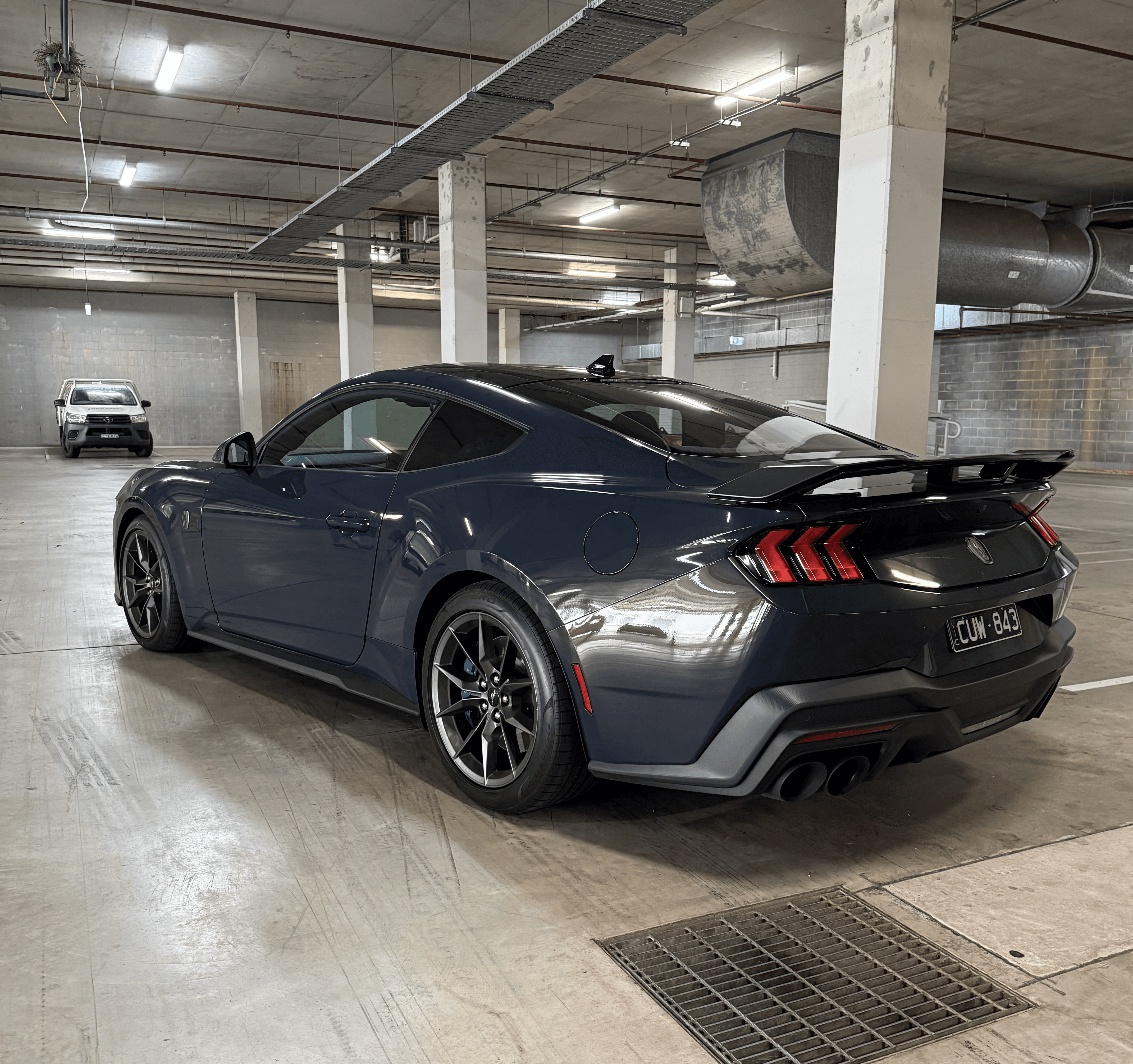 Visually, the Dark Horse leaves little ambiguity about its intent. While the underlying Mustang silhouette remains unmistakable, the Dark Horse layers on a more purposeful, motorsport-inspired edge. The front end adopts a sharper, more assertive look, with darker trim elements and revised aerodynamic detailing giving the car a noticeably more aggressive presence. Unique Dark Horse badging and darker accents reinforce its position above the standard GT without drifting into visual excess. Along the sides, the proportions remain classic Mustang — long bonnet, short rear deck — but subtle tweaks and wheel designs help sharpen the stance. The overall effect is less about reinvention and more about amplification. This is recognisably a Mustang, simply dialled further toward performance. At the rear, the familiar tri-bar lighting signature remains, complemented by darker finishes and performance-oriented detailing. Nothing feels ornamental; the design language stays cohesive and deliberate. The Dark Horse doesn’t chase drama — it projects intent.